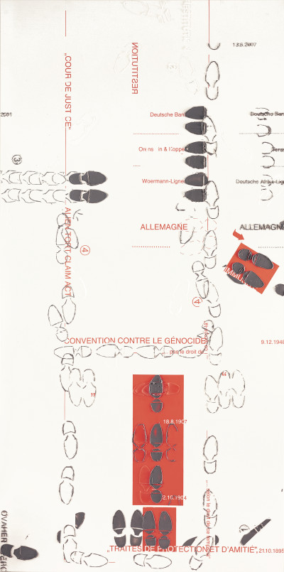 Damit – und mit der konflikthaften Begegnung künstlerischer und juridischer Sprachformen – artikuliert er auch eine grundlegende Nichtversöhnbarkeit. Denn bei seinem Ansatz kann es nicht um die Auflösung, sondern vor allem um die Darstellung eines historischen Problems der Nichtdarstellbarkeit gehen. Erst daran kann sich dieser zunächst “nur” ästhetische Zugang auch als Brücke zu heutigen postkolonialen Debatten um Entschädigungszahlungen erweisen. So treten sich nicht nur Abstraktion in der Malerei und die Abstraktionen des Völkerrechts gegenüber, zugleich wird auch die Frage unausweichlich, welche mindestens symbolischen Formen einer “Umkehrung” der sozialen und ökonomischen Effekte einer im internationalen Zusammenhang zu betrachtenden Kolonialzeit überhaupt möglich sind.